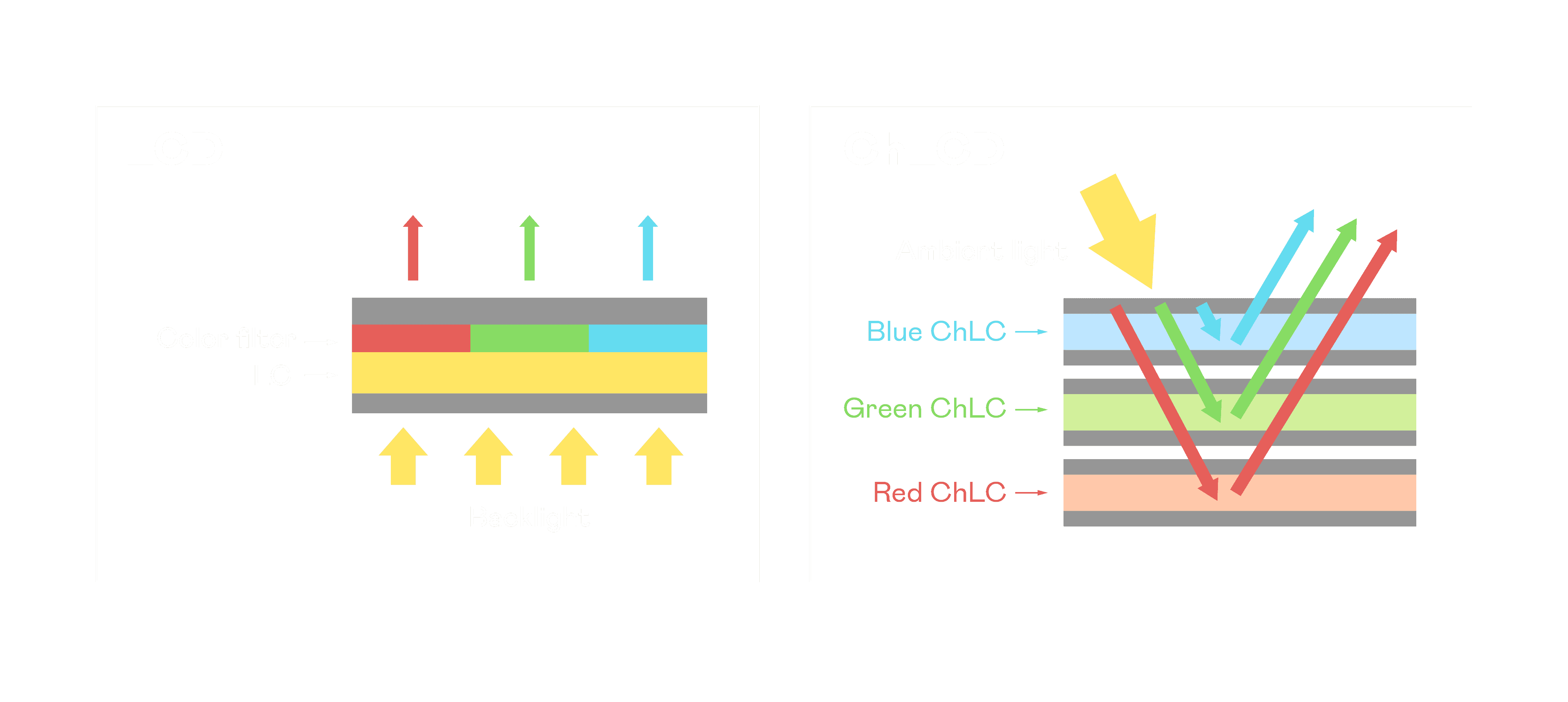 ChLCD 胆固醇液晶就如同纸张一样,,,,透过反射环境光来显示影像,,因此长时间观看不易造成人眼视觉疲劳,,可达到护眼效果。。。当处于户外阳光下使用,,LCD 影像容易失真而不易观看,,,,但胆固醇液晶仍可维持较佳的影像品质。。